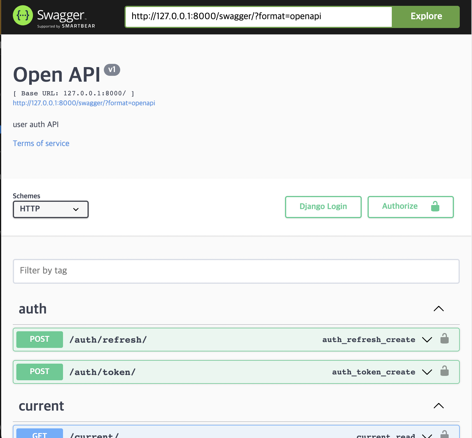 이제 앱을 실행하여 " http://127.0.0.1:8000/swagger/ " 에 접속하면 아래와 같은 화면을 얻을 수 있다.